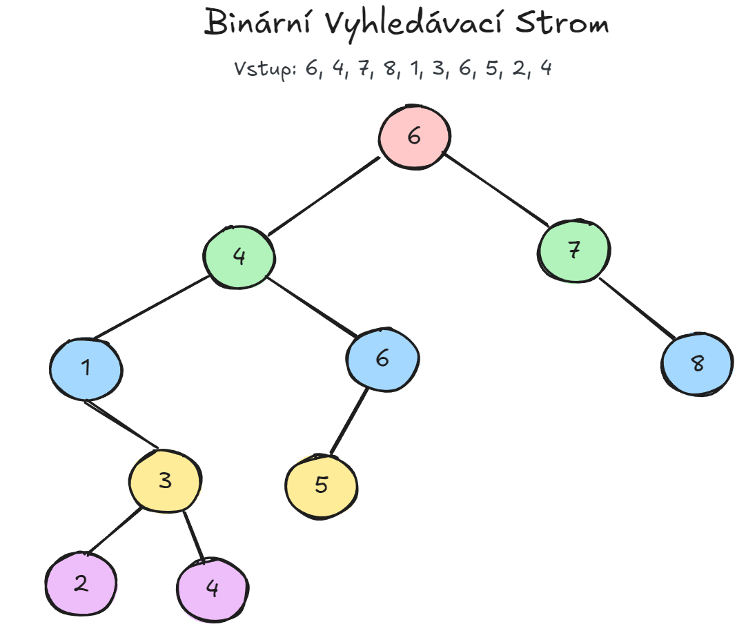 - Vložení prvku – hodnota se vkládá do levého nebo pravého podstromu rekurzivně.