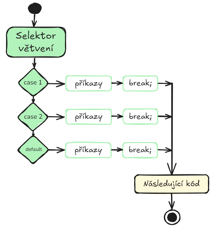 switch (selektor_vetveni){ case A: // Pokud se selektor vetveni vyhodnoti na A break; default: // Pokud neodpovida zadny predchozi case break;}